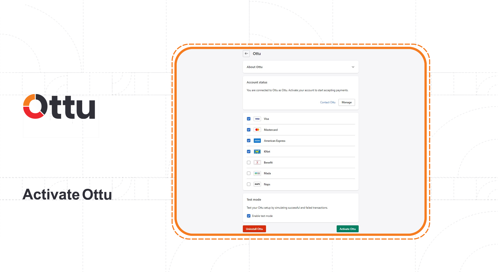 From the list provided, select the payment methods that you want to display to your customers. Then, click on `Activate Ottu`.